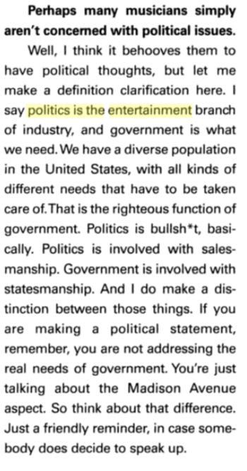 Anyway, about memes: As I watched the silly Gavin Newsom memes pop up last week, I kept thinking of that Frank Zappa quote meme that keeps circulating - the one about politics being the entertainment division of the military industrial complex...I started wondering if he actually ever said that, so I looked it up. So far, it seems as if he never said that. I'm inserting a screenshot of what he actually stated, (according to Google books,)as printed in his autobiography: :